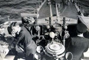 Sub Lt. F. D. Tolfree RNR O.O.W. HMS Westminster, Rosyth Escort Force on North Sea Convoy. Early 1944. Many Bristolians in RNVR from HMS Flying Fox served in this ship during the war. Derek Tolfree second from left, standing, with cigarette.