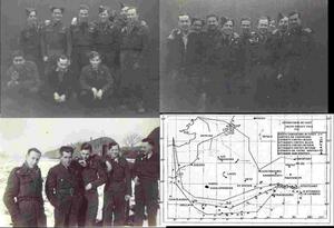 Above, some of the crew of Lancaster SR-V2 with unidentified faces and below left the crew, John Moore, Albert Tuuri, Eric Brown, Thomas Crane and John Hodgson. Bottom right, the annotated Operation Report from the RAF Night Operations on Stuttgart July 28th-29th 1944 when they failed to return.