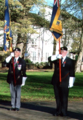 Remembrance Sunday 13 November 2005 at the Cenotaph, Whitehaven, Cumbria. George Dunn (left) with the Normandy Veterans Association Standard and Jimmy Hughes (right) with the Kells British Legion Standard during the wreath laying ceremony. [Photograph by Joseph Ritson]