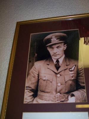 The framed photograph displayed on the wall inside Egremont Royal British Legion, Cumbria. It honours Squadron Leader Jack Blair awarded the DFC and DFM during World War Two. [Photograph by Joseph Ritson]