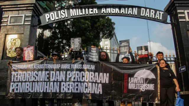 Keterangan gambar, Sejumlah aktivis membentangkan poster dan spanduk saat aksi solidaritas untuk Andrie Yunus di depan Markas Pusat Polisi Militer Angkatan Darat, Jakarta, Kamis (16/4/2026). Mereka menuntut persidangan kasus penyiraman air keras terhadap Andrie Yunus digelar di pengadilan sipil.