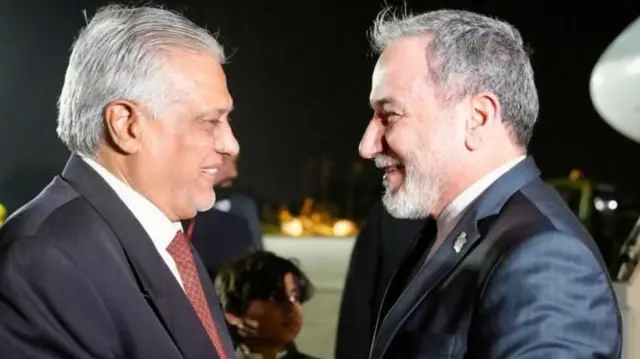 फोटो कॅप्शन, इराणच्या परराष्ट्र मंत्रालयाने एक फोटो प्रसिद्ध केला आहे. त्यात पाकिस्तानचे उपपंतप्रधान इसहाक दार हे इस्लामाबादमध्ये इराणचे परराष्ट्रमंत्री अब्बास अरागची यांचे स्वागत करताना दिसतात.