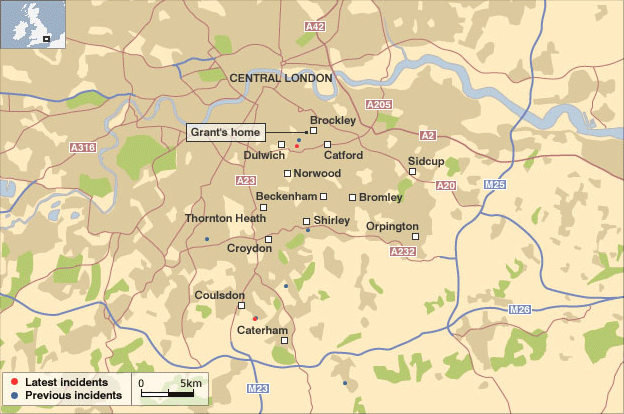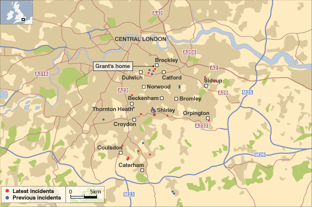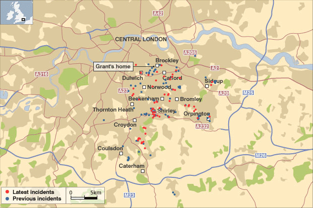 The attacks took place in Warlingham, Shirley, Beckenham, Bromley, Addiscombe, Orpington and West Dulwich.