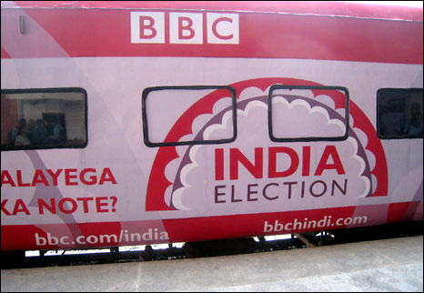 قطار بی بی سی که کمی قبل از شروع مرحله سوم انتخابات حرکت خود را آغاز کرده است از دهلی به احمد آباد در گوجرات می رود سپس به بمبیی در مهاراشترا می رود و بعد وارد حیدآباد می شود.