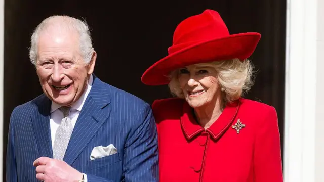 Po jego lewej stronie stoi królowa Kamila. Ma na sobie jaskrawoczerwoną marynarkę z broszką w kształcie krzyża oraz czerwony kapelusz dopasowany kolorystycznie do stroju. Ona również patrzy prosto przed siebie i uśmiecha się