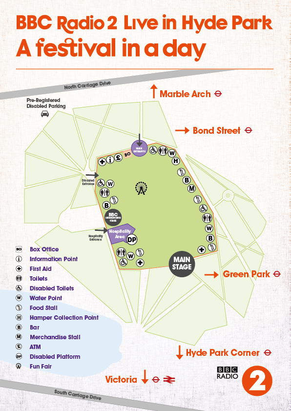 BBC Radio 2 Live In Hyde Park is held on an open air greenfield site. It is therefore advisable that you check the weather forecast in advance to ensure you bring appropriate clothing. It can be very hot during the day in September so sunscreen is a good idea. It can also get quite chilly later in the evening so come prepared with some warm clothing as well. In the event of rain waterproof clothing, umbrella and wellington boots are recommended.