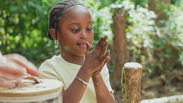 In Tall Trees Forest, Lisa and a group of children make pretend cakes, learn British Sign Language signs for pat, cake and baby, and sing and sign the rhyme Pat-a-Cake.
