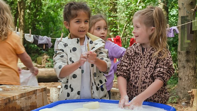 In Tall Trees Forest, Lisa and the children have bubbly fun washing toy clothes, learning British Sign Language signs for jungle, clothes and washing, then they sing and sign Down in the Jungle.
