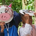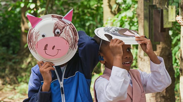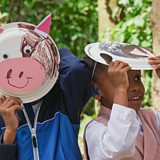 Lisa and the children create animal masks to pretend to be farm animals, learn signs for farm, old and pig, and sing and sign Old MacDonald Had a Farm.