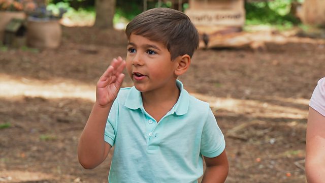Lisa and the children play with rubber ducks, learning BSL signs for ducks, far away and swimming, then sing and sign Five Little Ducks Went Swimming One Day.