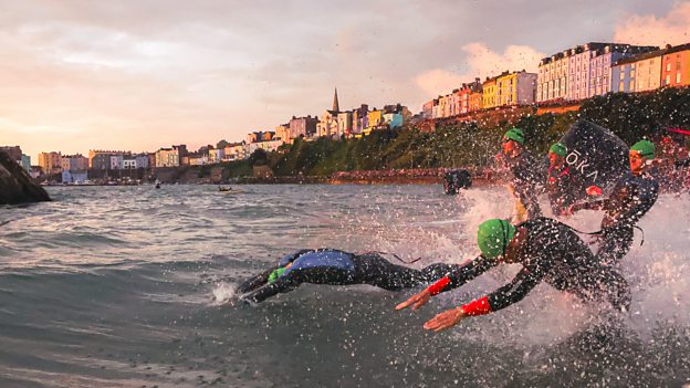 the event features a 2.4 mile sea swim, 112 mile Cycle race and a 26.2 Run. Featuring Welsh speaking athletes who are taking part in this iconic event.
