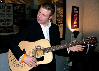 Dermot gets ready for the big night ahead with a spot of practise on the guitar that's being signed by as many stars as he can get his hands on at the BRITs
