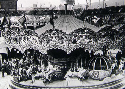 Gallopers at Blackburn Wakes. Green's Dragon Scenic on the right, Pat Collins' Whales Island Scenic on the left and Reuben Holdsworth's Pigs and Balloons centre. Date and location unknown.