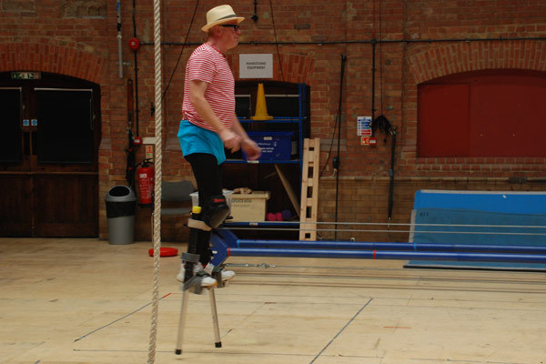 Chris was soon ambling around on his stilts. In fact he was quite prepared to wear them all the way home...