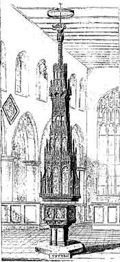 |  The beautiful font of Ufford church that the parishioners refused to give up to destruction. Drawing from 18th century. | Bures The village church of Bures on the Essex/Suffolk border. During the reign of Elizabeth, it was the centre of a furious row following an outbreak of popular iconoclasm and shows how the religious fervour of poorer parishioners sometimes outstripped that of the local gentry. About 20 radical Protestants hacked down all the screens of the church to waist height, destroyed the Easter Sepulchre canopy over the finest of the Waldegrave tombs and damaged another monument. An outraged local gentry institued an action in the local courts and successfully complained to the Privy Council. This case is seen as being influential in the issuing of a proclamation against the destruction of monuments and memorial glass in September 1560.