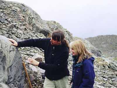 | The rock they're looking at contains the oldest traces of life (c. 3.8 billion years ago) (prog 3). They were discovered by Minik Rosing, a native Greenlander based at the Danish Geological Museum. | |||