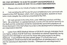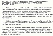 |  |  |  | Allegations about Illness Caused By Injections |  |  |  | A Government tribunal has ruled that a British soldier's illness came from a number of injections he received in preparation for the 1991 Gulf War.