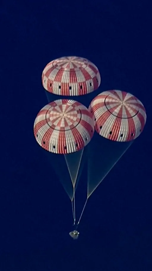 Затем настала очередь вспомогательных небольших парашютов, которые вытащили три основных парашюта с диаметром купола уже более 35 метров. На них, на скорости около 20 миль (более 32 км) в час, «Орион» и «плюхнулся» в Тихий океан.