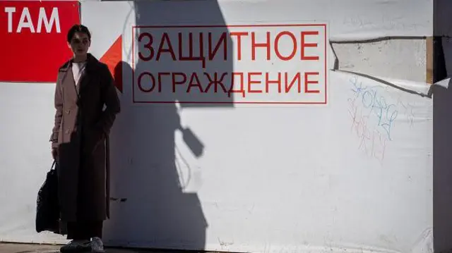 Женщина стоит у надписи на стене "Защитное ограждение" в Белгороде