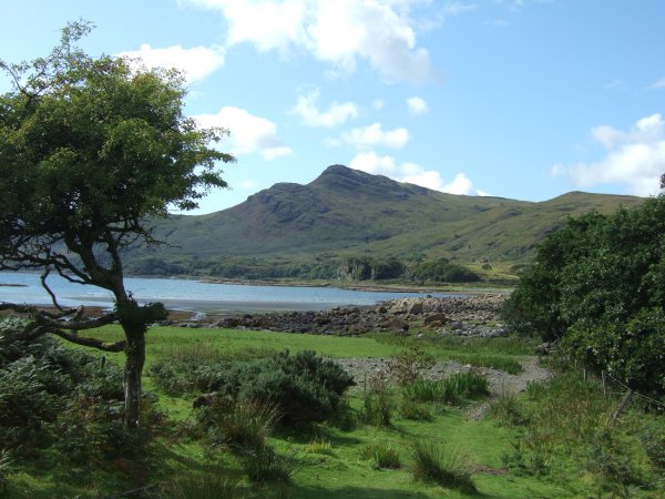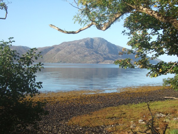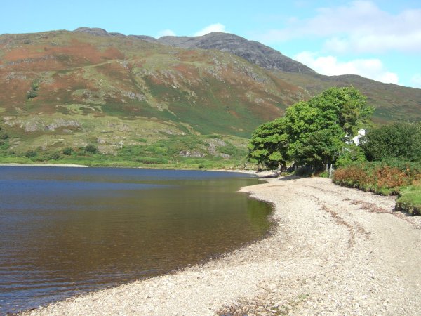 The pebble beach at the head of Loch Uisg with Creach Bheinn behind