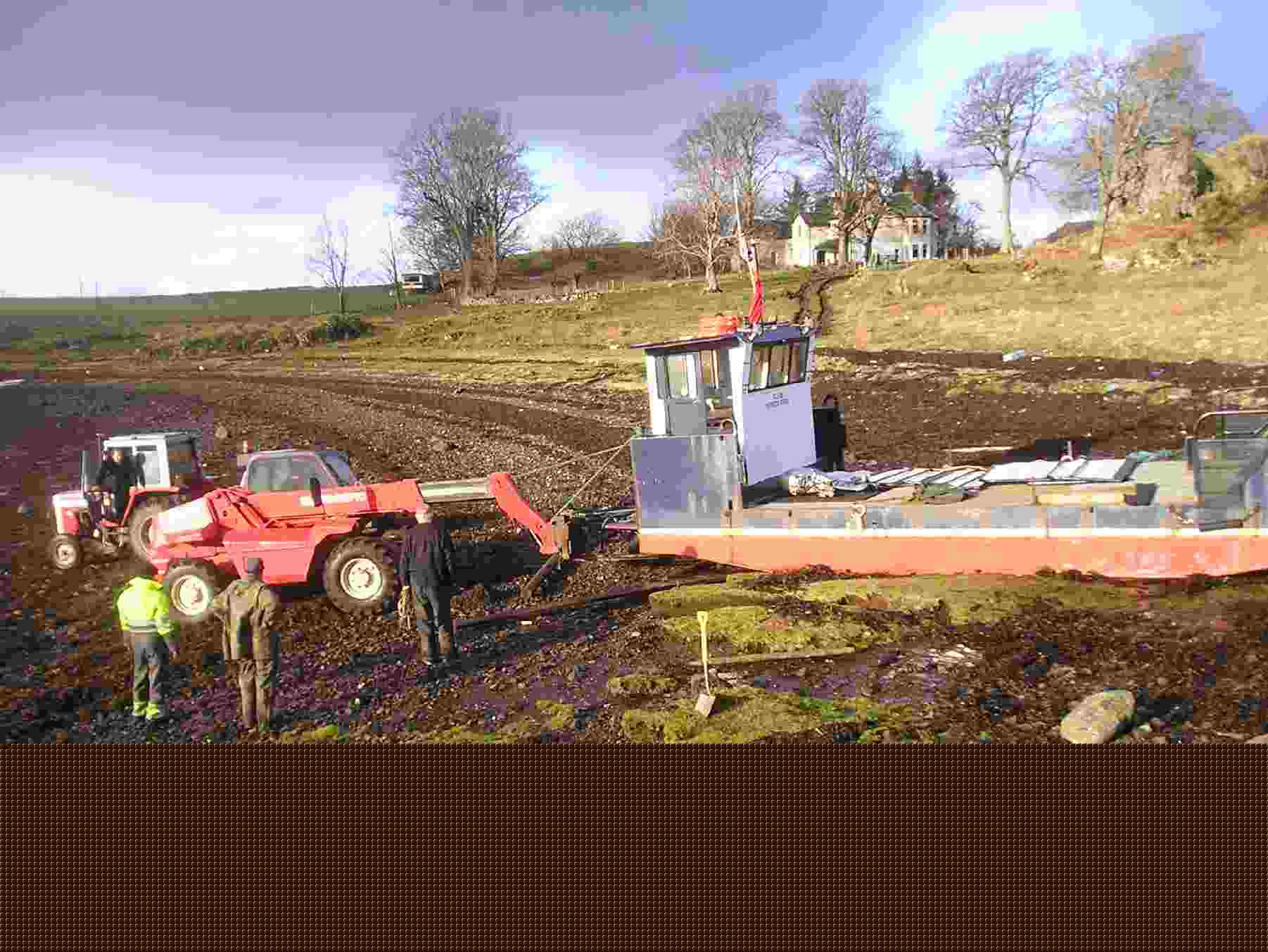 We started to try and raise the boat with the trolley jack...enough to get the assorted pieces of wood and telegraph pole underneath, but she would not budge an inch....and without the arrival of the tractor and forklift, things looked a bit hopeless, even with a full Rugby pack of Kerrera's finest....however soon we heard a distant roar, and it sounded like help was at hand, and after a slight delay to clear a fallen tree from the track ....The Manitou and Massy Ferguson cavalry appeared on the horizon. Pretty quickly my doubts about the forklift were resolved because it was very clear this was not your ordinary baked bean stacker....and in a very short time we had the wood in place and the ropes on ready for the first pull.