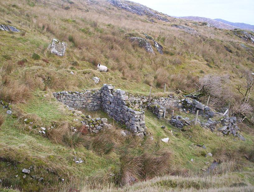 Murchadh Beachd, Padruig's brother married Padruig's wife's sister, Effy (also known as Euphemia or Henrietta in the various records) in 1874. He built this house just across the burn from Padruig. He seems also to have prospered at the fishing - so much so that he and his wife employed a domestic servant who lived with them at the time of the 1881 census. Effy's own family had a hard life before coming to Molinginish. She was born in the island of Pabbay (pictured below - acknowledgement to Wikipedia) in about 1844, the daughter of Norman Campbell and his wife Marion Morrison. The family along with the whole of the rest of the population of Pabbay were evicted in 1846. They then moved to Berneray where Margaret, Padruig's wife was born, probably shortly after they arrived in Berneray. Norman at first had land in Berneray - in 1851 he had ten acres - but later he lost that land, as latterly he was described as a cottar. After Effy died in 1922 Murchadh, like his brother Padruig moved to stay with their neice Ann - daughter of their brother Finlay - Fionnlagh Shodhaidh - of whom more later. Murchadh died in 1926. The top end of his house was converted into a byre and the stone taken from the other walls for this. At the bottom end of the house and obscured by trees is the little house built and occupied by his nephew John Campbell - Am Balbhan, after his moving from the Shiants - of whom also more later.