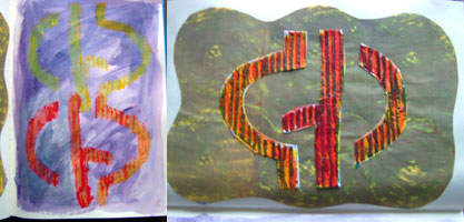 I have not done much art to be shown recently, my painting and drawing last weds is not finished and not to be shown, the only thing I have done is play paint, print and a little collage on a sheet of card, the sheet it not going to stay large the intention is to cut it up for some cards, here are 4 progress shots,