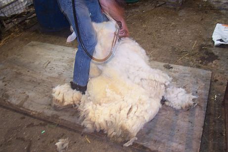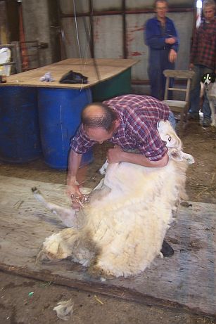 The sheep was eased this way and that - it seemed as if she were being slowly rolled out of her fleece! (You can see a muzzle poking out behind his knee...)
