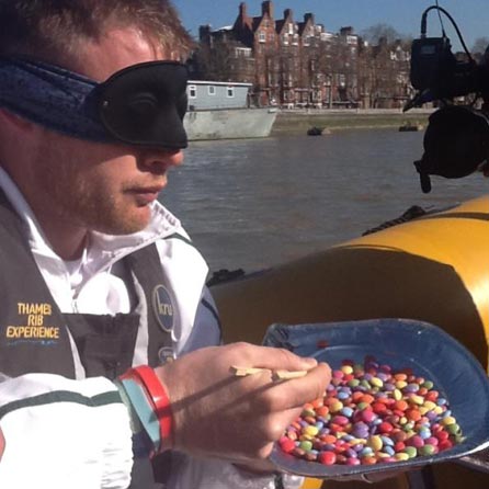 @sportrelief: On the way and the big man needs to eat 18 smarties. Blindfolded. Using chopsticks. #freddies12