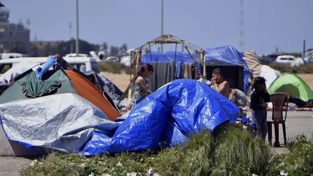 Fotoğraf altı yazısı, Lübnan'da çatışmalar nedeniyle evlerinden edilen kişiler yol kenarlarındaki derme çatma çadırlarda kalıyor