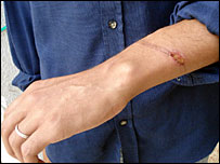 تینوں بھائیوں کی آنکھوں پر پٹیاں باندھ دی گئیں اور ہاتھوں کو پشت پر لے جا کر ان میں پلاسٹک کی ہتھکڑیاں پہنا دی گئیں۔ ہاضم نے مجھے اپنی کلائیاں دکھائیں ہتھکڑیوں سے آنے والے گھاؤ اگرچہ اب بھرنے لگے ہیں لیکن ان کی موجودگی کو محسوس کیا جا سکتا ہے۔
