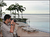 Ngày làm việc đầu tiên ở Amazonas bận túi bụi với những cuộc phỏng vấn và di chuyển, khiến tôi không còn thời gian để đi thăm nhà hát Teatro Amazonas và chụp vài tấm hình. Thời hoàng kim vào cuối thế kỷ 20, các đại gia xứ này đã thuê kiến trúc sư từ Lisbon thiết kế, chở sắt từ Scotland sang, chuyển đá và kính từ Ý về, và gỗ thì có sẵn nhưng phải cầu kỳ mang qua châu Âu chạm khắc. Và cao su – thứ hàng hoá đắt đỏ và độc quyền của xứ này – được dùng để lót đường cho những chuyến xe chở khách tới cửa nhà hát trong im lặng tuyệt đối. Nếu nhìn quanh thì quí vị sẽ thấy hôm nay xứ này vẫn còn giàu sang như vậy, như khách sạn nơi chúng tôi phỏng vấn một vị dân biểu của bang, không chỉ lộng lẫy mà còn biến cả một đoạn bờ sông thành thiên đường với cây cảnh và hồ bơi nhìn ra sông rộng hút tầm mắt, bên kia là rừng già. Còn khách sạn nơi tôi ở thì hồ bơi và sauna đặt trên nóc, tầng thứ 20, vừa nhìn ra sông lẫn nhìn vào khu cao ốc mọc lên sừng sững như bất kỳ thành phố nào. Còn chuyện chủ các khách sạn kiểu như thế này mua piano điện tử giá cả chục ngàn đô để bày chơi ngoài tiền sảnh là cảnh thường gặp. Anh bạn đồng nghiệp từ ban Trung Quốc tâm sự là anh không ngờ là nơi đây không hoang sơ như anh nghĩ, thậm chí có cả siêu thị và trung tâm mua sắm sang trọng như bao thành phố lớn khác trên thế giới. Đơn giản là vì có nhiều doanh nhân giàu có tới đây làm ăn, ví dụ như một chủ doanh nghiệp gỗ lót sàn nhà nói có những vị khách Trung Quốc đến nơi hỏi mua cả ngàn công-ten-nơ một lúc.