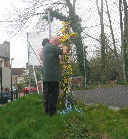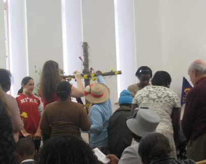 On Easter Sunday morning, during the service, some of the children come in with baskets of flowers. Everyone in the congregation is invited to come up, take one of the flowers and put it on the cross