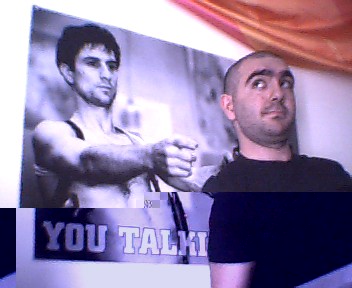 I say goodbye with this photo which I took this afternoon in my Turin apartment with my webcam. Behind me the mythical Robert De Niro in Taxi Driver. I bought this poster in Camden Town during my London holiday which I talked about some posts ago. It is a shot from the famous scene in which De Niro, aiming his gun against the wall, says ‘you talkin’ to me?’